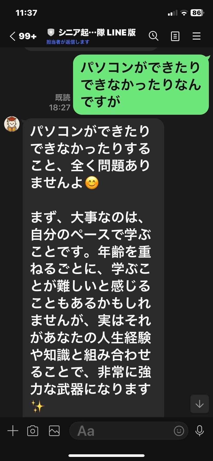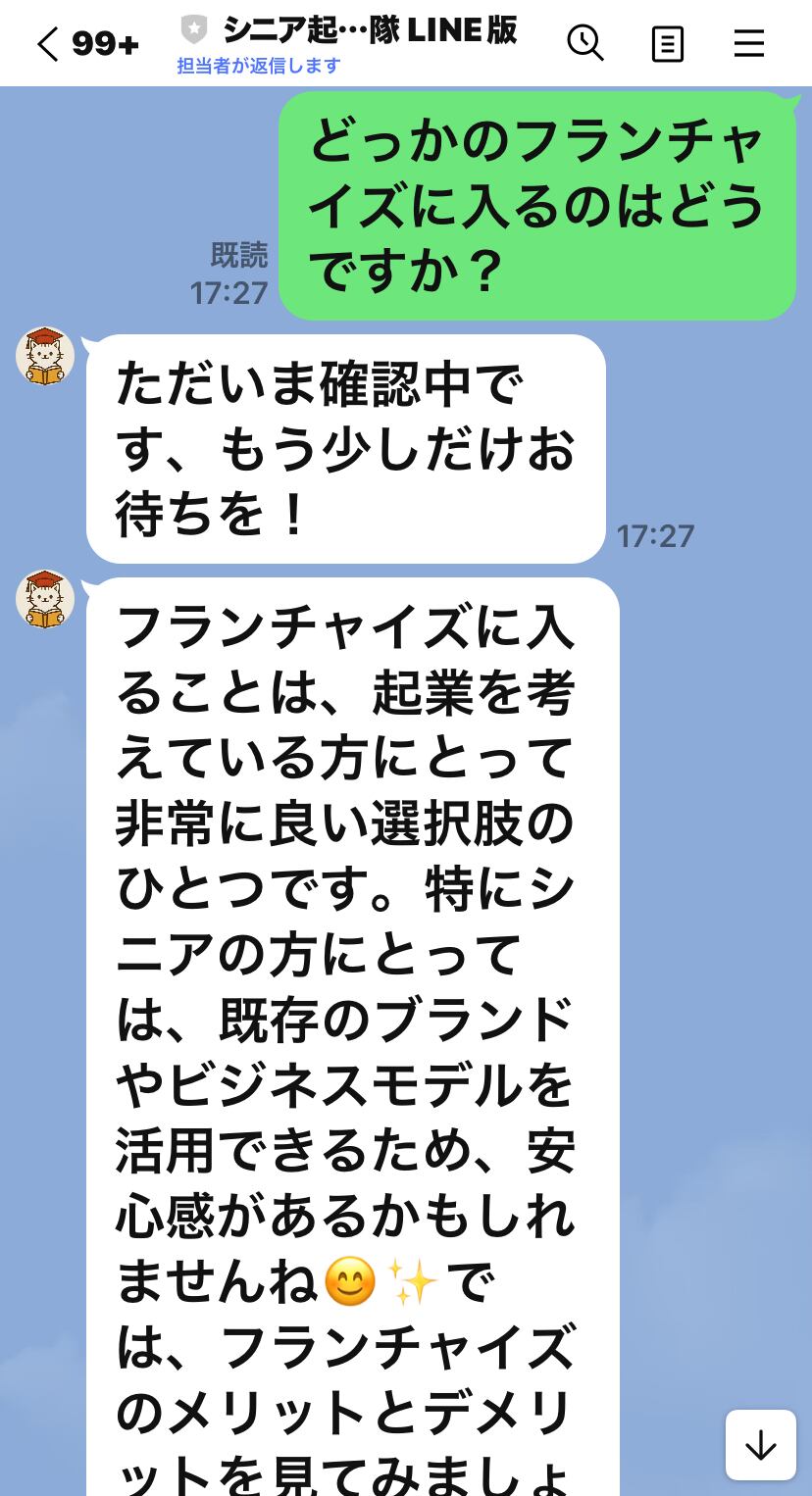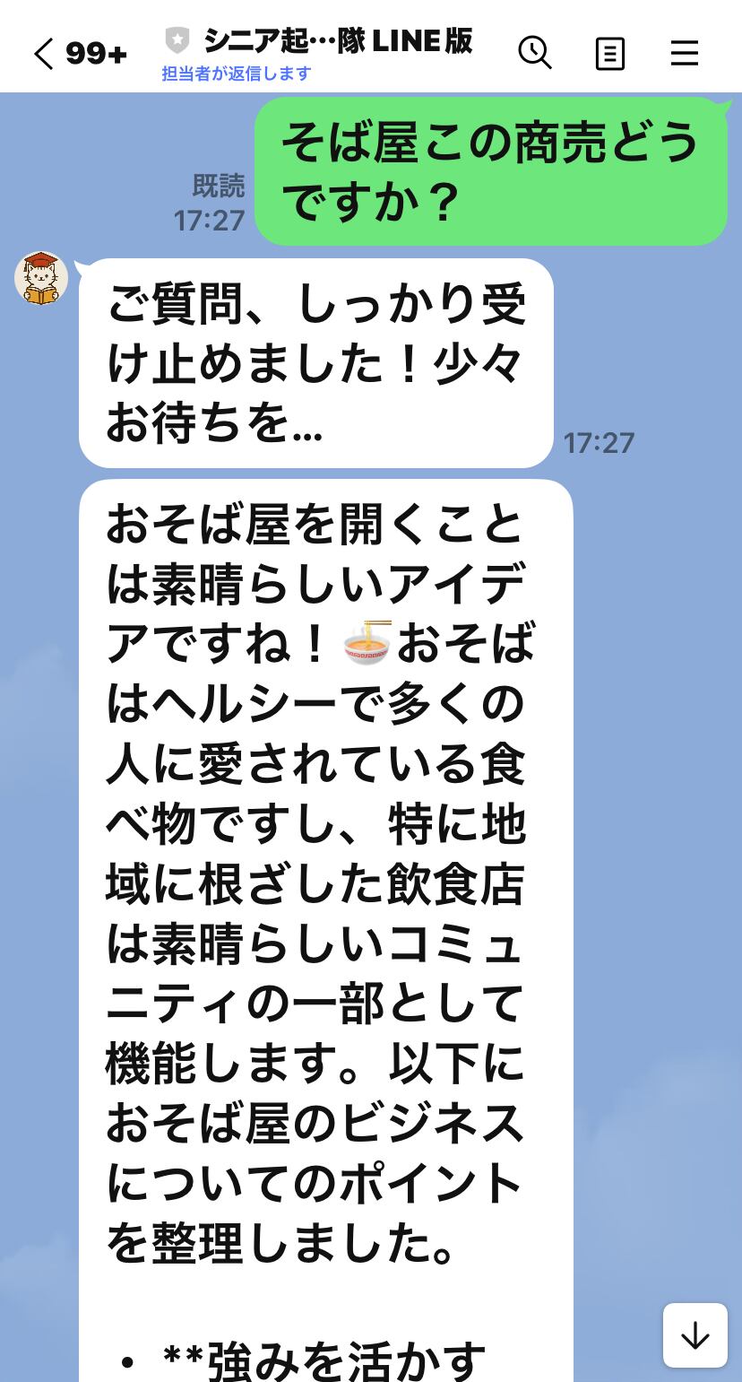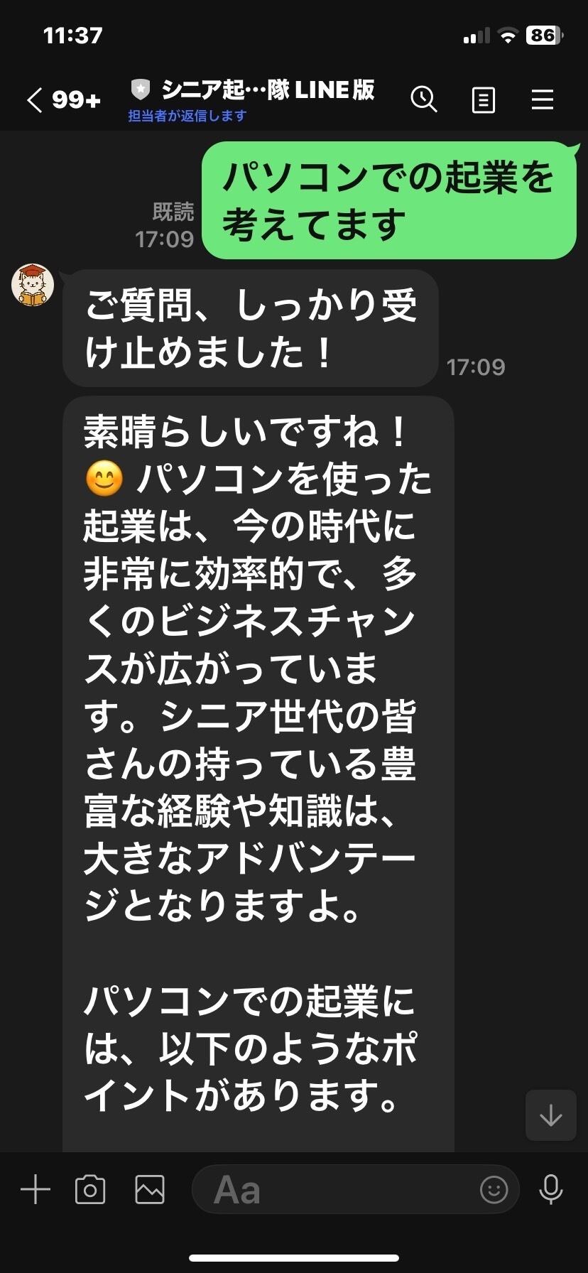 AIに対応していますので、シニア起業家の方のご質問に丁寧親切に答えてくれます。